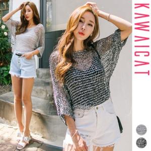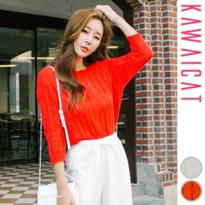 7分袖透かし編みニットトップス